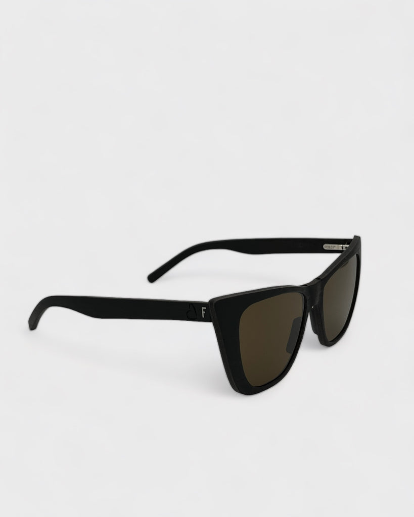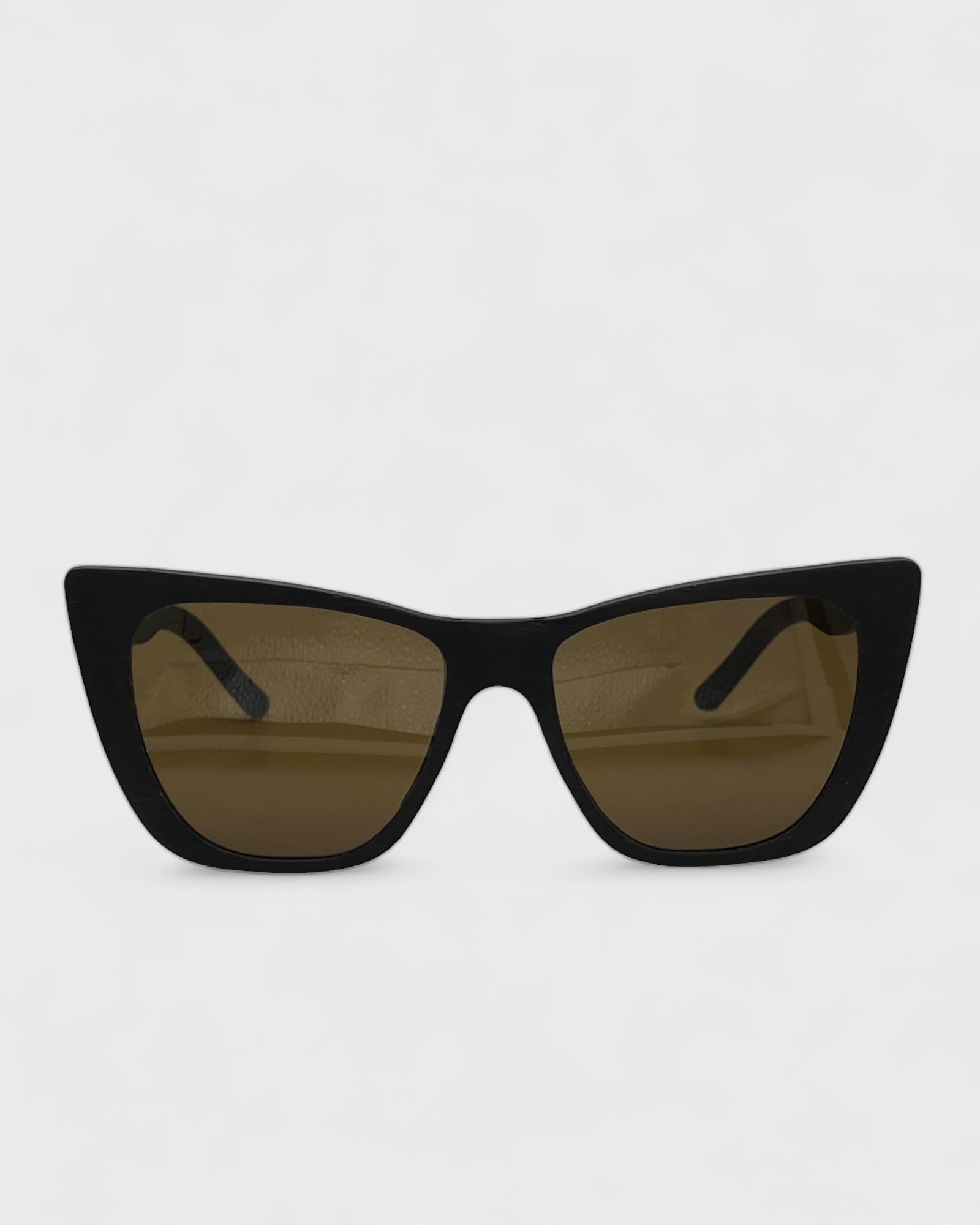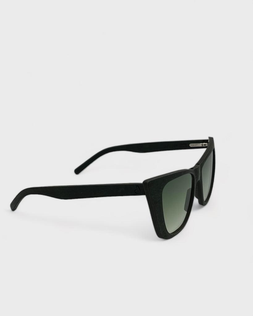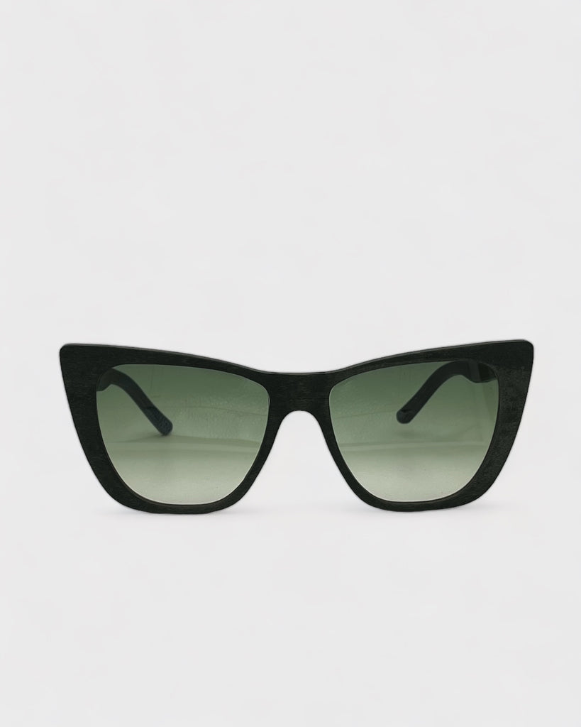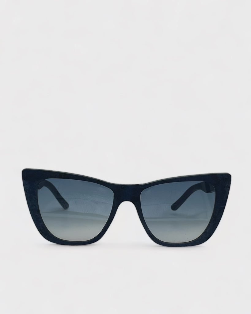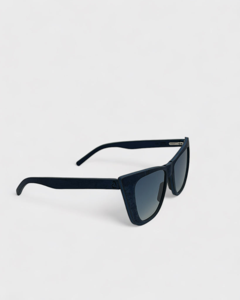 Montatura in legno naturale color blu notte con finitura satinata e lenti sfumate UV400.